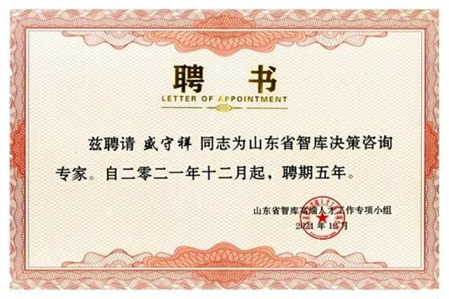 導(dǎo)讀:近日,接山東省智庫高端人才工作專項小組辦公室通知,公司董事長盛守祥入選2021年山東省智庫高端人才,獲聘經(jīng)濟建設(shè)領(lǐng)域山東省智庫決策咨詢專家。
