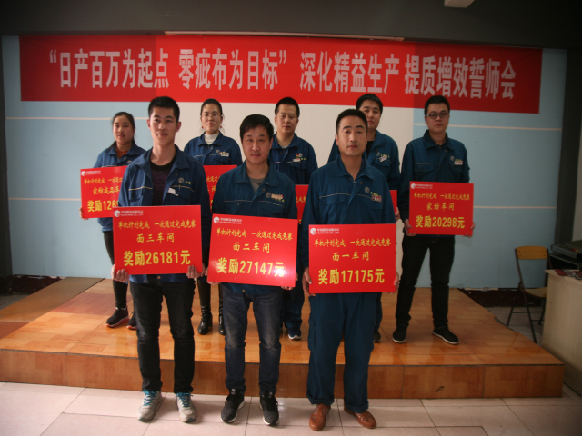 3月3日,公司召開主題為“日產(chǎn)百萬為起點(diǎn)、零疵布為目標(biāo)”深化精益生產(chǎn)、提質(zhì)增效誓師大會(huì),公司高管、分公司經(jīng)理、業(yè)務(wù)經(jīng)理、車間主任、職能部室主任、輪班長(zhǎng)、技術(shù)員和機(jī)組長(zhǎng)代表近200人參加會(huì)議。會(huì)上,公司黨委書記、董事長(zhǎng)王力民為今年1-2月份各車間“單機(jī)計(jì)劃完成率”、“一次通過率”競(jìng)賽優(yōu)秀機(jī)臺(tái)代表頒發(fā)獎(jiǎng)勵(lì)牌,并圍繞進(jìn)一步強(qiáng)化精益生產(chǎn)做重要講話;總經(jīng)理閆英山對(duì)精益生產(chǎn)執(zhí)行情況,特別是今年1-2月份情況進(jìn)行了深入分析總結(jié),提出了新的任務(wù)與目標(biāo)。